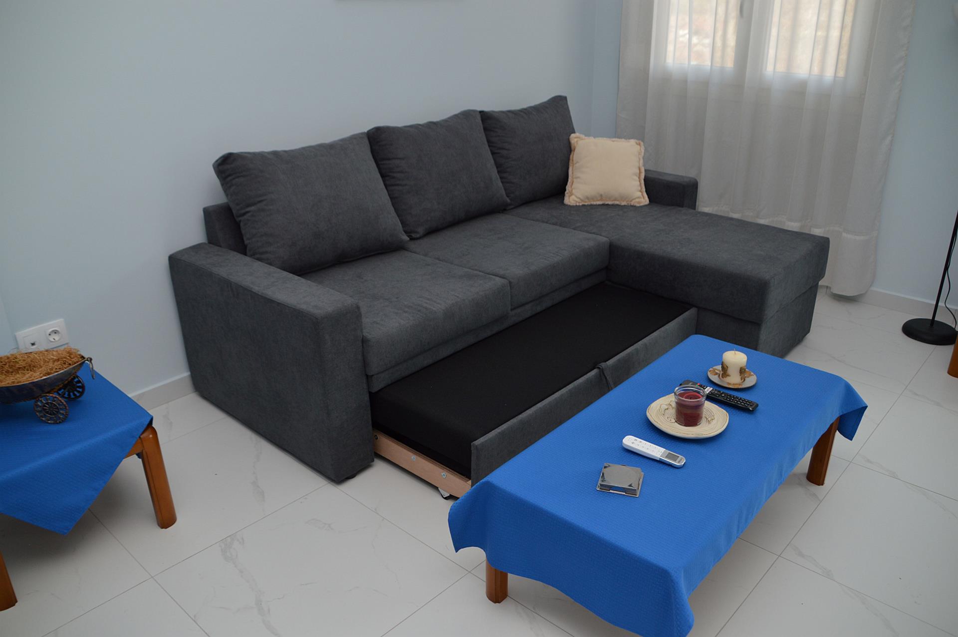 • Open Plan Living Room and Kitchen: The living room and kitchen area is open plan and includes a sofa bed that can accommodate two people. The open space is equipped with air conditioning for complete comfort.